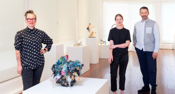 Image: Virginia Leonard’s sculpture with judges (left – right) Sanné Mestrom, Megan Monte and Justin Paton. Credit Woollahra gallery